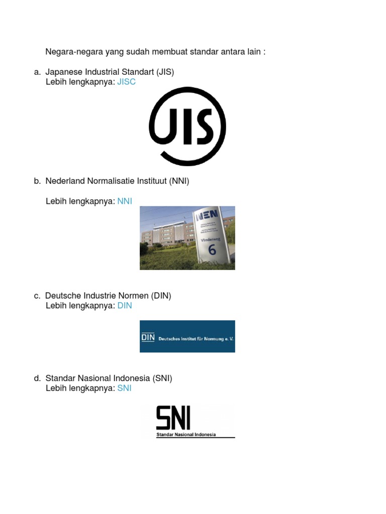 JIS Japanese Industrial Standard standar industri di negara Jepang. Negara kita juga pun punya standar nasional. Indonesia saat ini sudah mempunyai standarisasi industri yaitu SNI Standar.